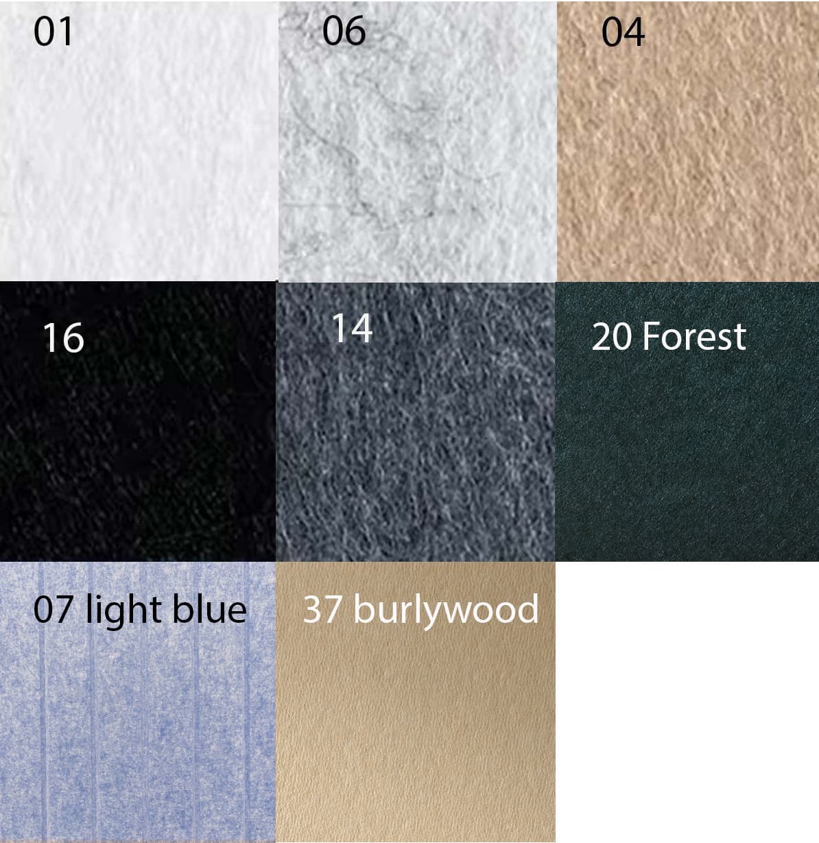| Kleur | 01 White, 04 Beige, 06 silver, 07 light blue, 14 dark grey, 16 Black, 20 forest, 37 burlywood |